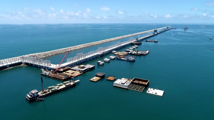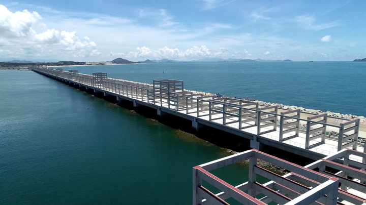 ▲茂名港務(wù)中心項目 在這乘風(fēng)破浪、跨越發(fā)展的十年里,茂名港深水大港崢嶸初現(xiàn),碩果累累——實現(xiàn)資產(chǎn)規(guī)模和融資規(guī)!半p百”目標(biāo),為濱海新區(qū)基礎(chǔ)設(shè)施建設(shè)和茂名港集團發(fā)展提供資金保障,融資平臺作用凸顯;自建、參建省市重點項目超30個,推動博賀新港區(qū)東西防波堤、10萬噸級成品油碼頭、東區(qū)化工碼頭、東區(qū)化工倉儲、粵西LNG造陸項目、茂名港務(wù)中心、博賀灣大橋、供水工程等一批省市重點項目建設(shè)投用,充分發(fā)揮濱海新區(qū)項目建設(shè)主體作用,加快推進口岸開放工作,為茂名經(jīng)濟實現(xiàn)高質(zhì)量發(fā)展增添動力。 前瞻布局,打造南海能源新通道,積極融入茂名“向海而興”發(fā)展大局。