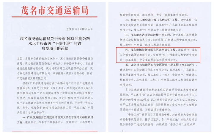 2月2日,茂名市交通運輸局下發(fā)《茂名市交通運輸局關于公布2022年度公路水運工程市級“平安工地”建設典型項目的通知》文件,對2022年度公路水運工程平安工地建設成效突出的項目進行表彰通報。集團建設的茂名港博賀新港區(qū)東區(qū)油品碼頭工程獲評“平安工地”稱號,這已是油品碼頭工程連續(xù)3年榮獲該項榮譽。