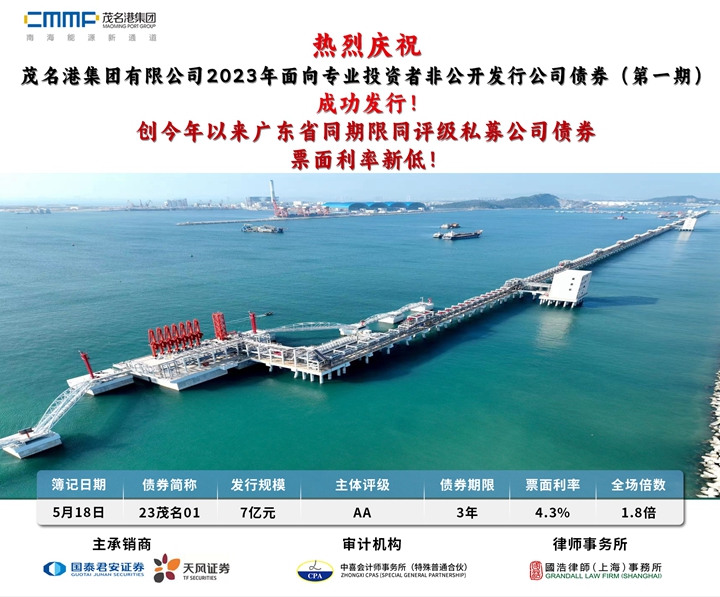 熱烈慶祝茂名港集團有限公司2023年面向?qū)I(yè)投資者非公開發(fā)行公司債券(第一期)成功發(fā)行!