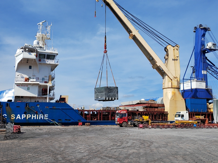 近日,外貿(mào)船舶“藍(lán)寶石”輪順利靠泊港口經(jīng)營公司碼頭裝運(yùn)大型外貿(mào)設(shè)備,這是港口經(jīng)營公司今年以來首次靠泊的萬噸級(jí)外貿(mào)船舶。