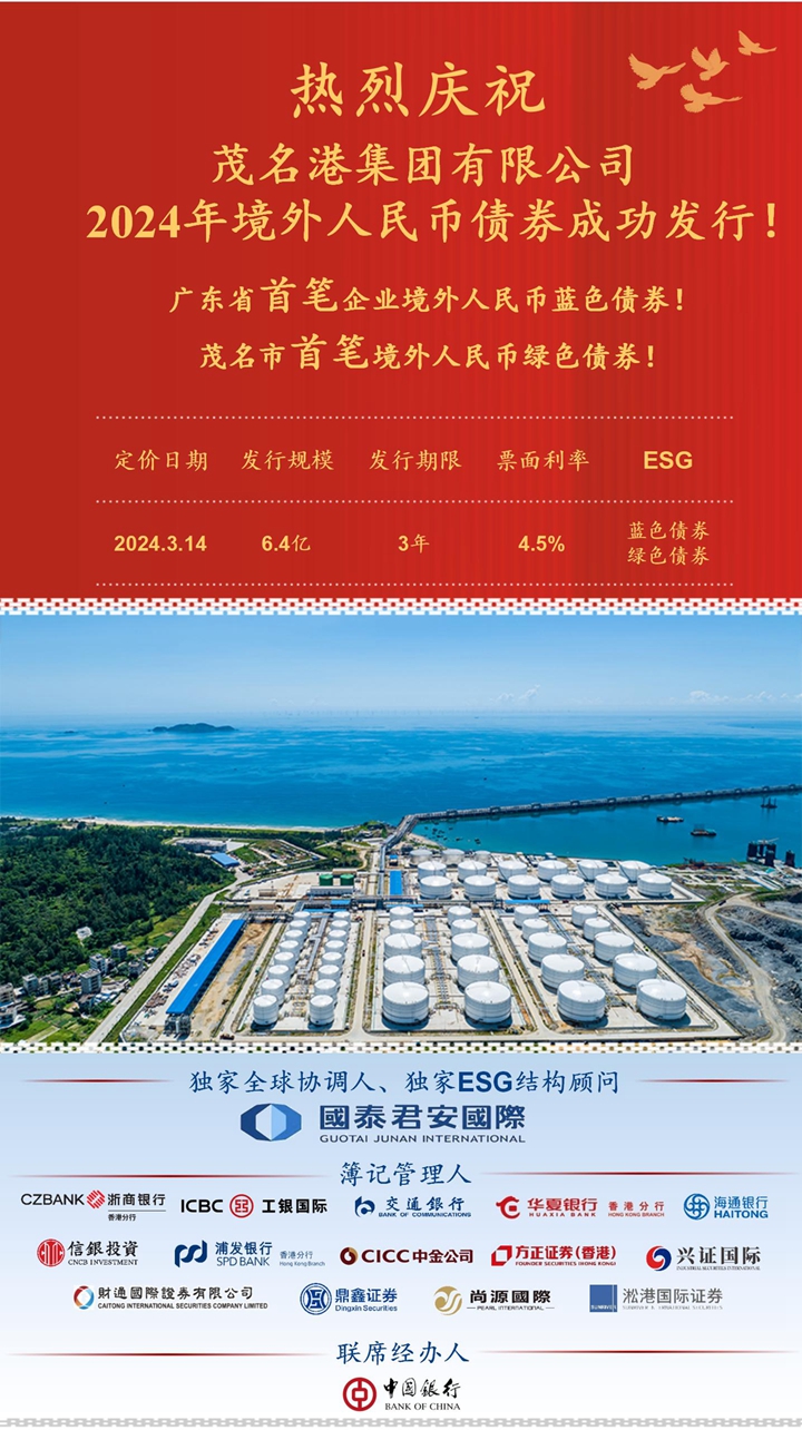 3月14日,茂名港集團有限公司成功定價2024年境外人民幣債券,發(fā)行規(guī)模6.4億人民幣、票息4.5%。債券在香港和澳門兩地交易所上市,作為廣東省首筆企業(yè)境外藍色債券、茂名市首筆境外人民幣綠色債券,為清潔能源、綠色交通、可持續(xù)發(fā)展的新質生產(chǎn)力等重要領域提供了資金支持。