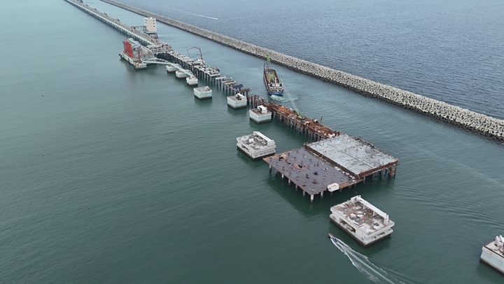據(jù)悉,30萬噸級原油碼頭設(shè)計(jì)年吞吐量達(dá)1600萬噸,泊位長度達(dá)404米,碼頭共設(shè)計(jì)有145根樁基,由工作平臺及工作樓平臺的70根樁基和附屬管廊橋工程的75根樁基組成,其中工作平臺及工作樓平臺的70根樁基已于2023年底全部完工。